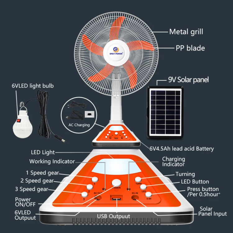 پنکه خورشیدی ۱۶ اینچی EP-317A | طراحی مدرن با نور LED و شارژ چندمنظوره برند Easy Power